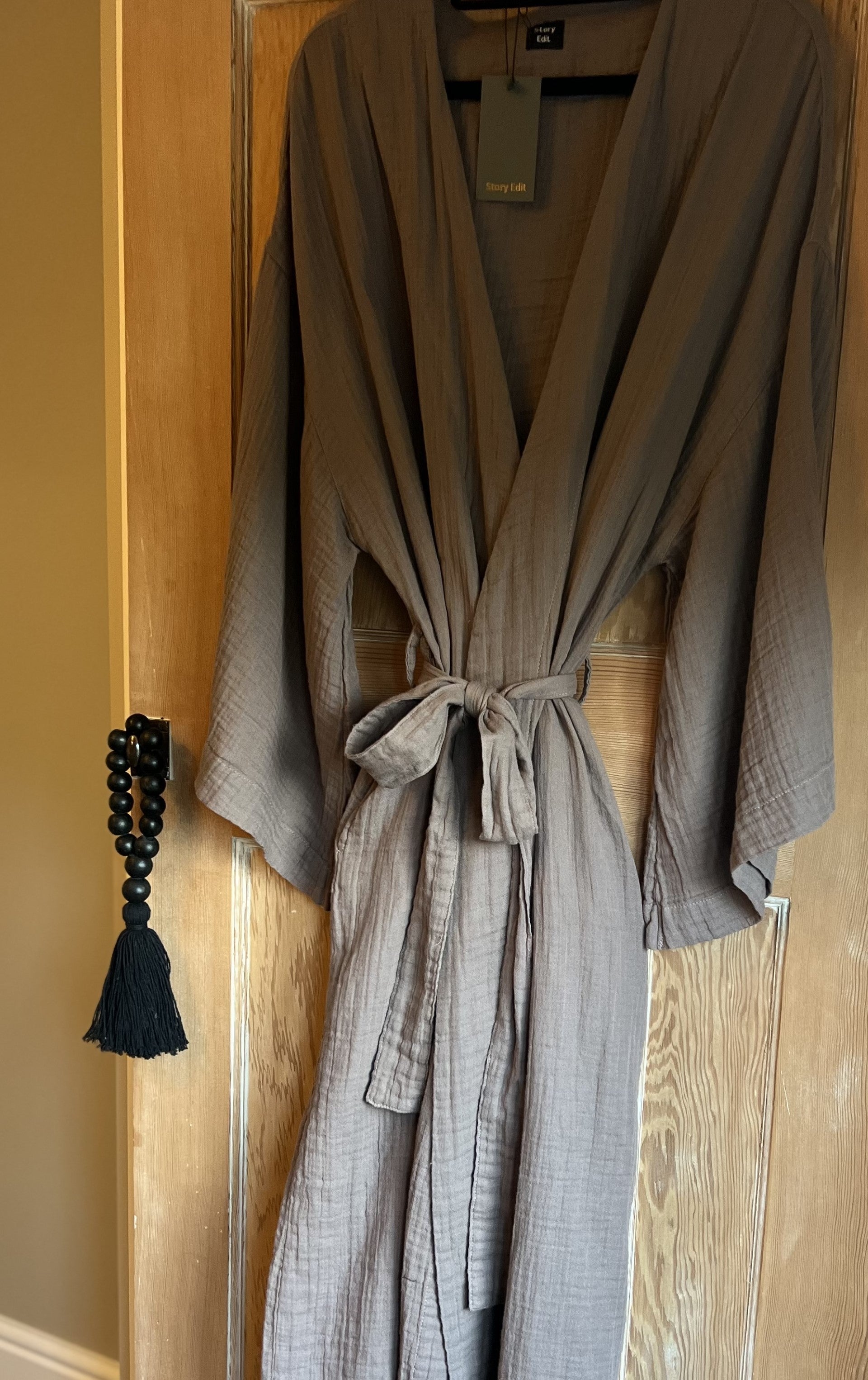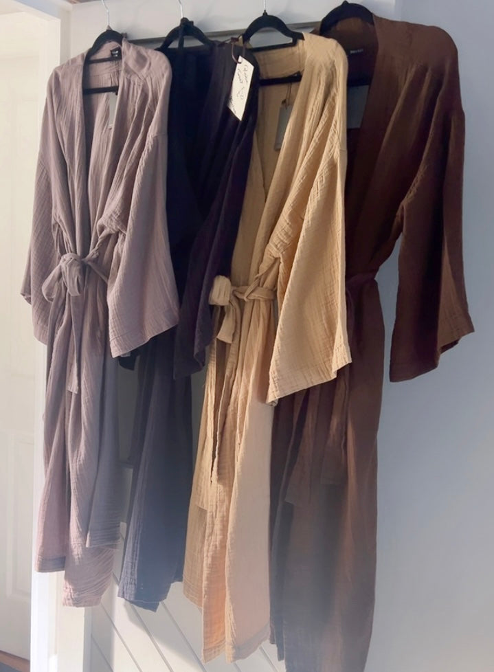 Beautiful kimono robe in 100% organic cotton. Neutral colour palette- Taupe, Black, Sand, Saffron, Cocoa & Stripe. Matching top/ long pant/shorts available. More photos available soon.