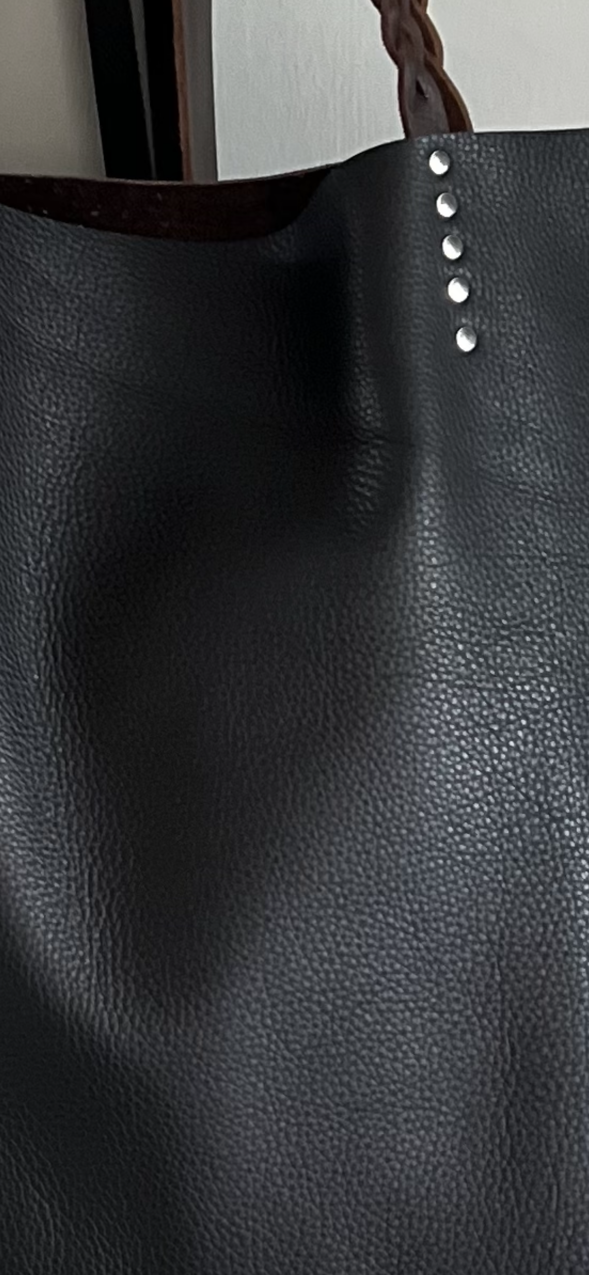 Chocolate brown handmade leather tote with pocket inside and plaited brown leather straps.