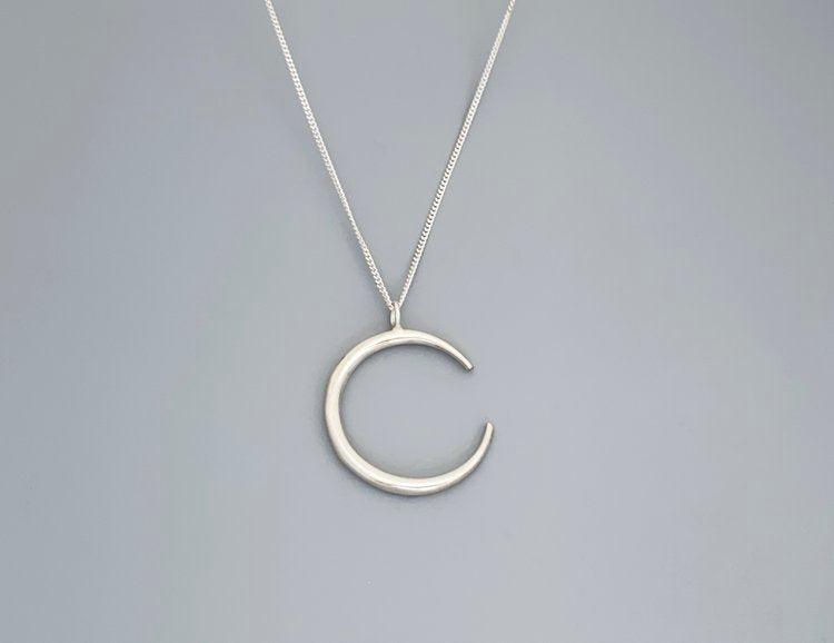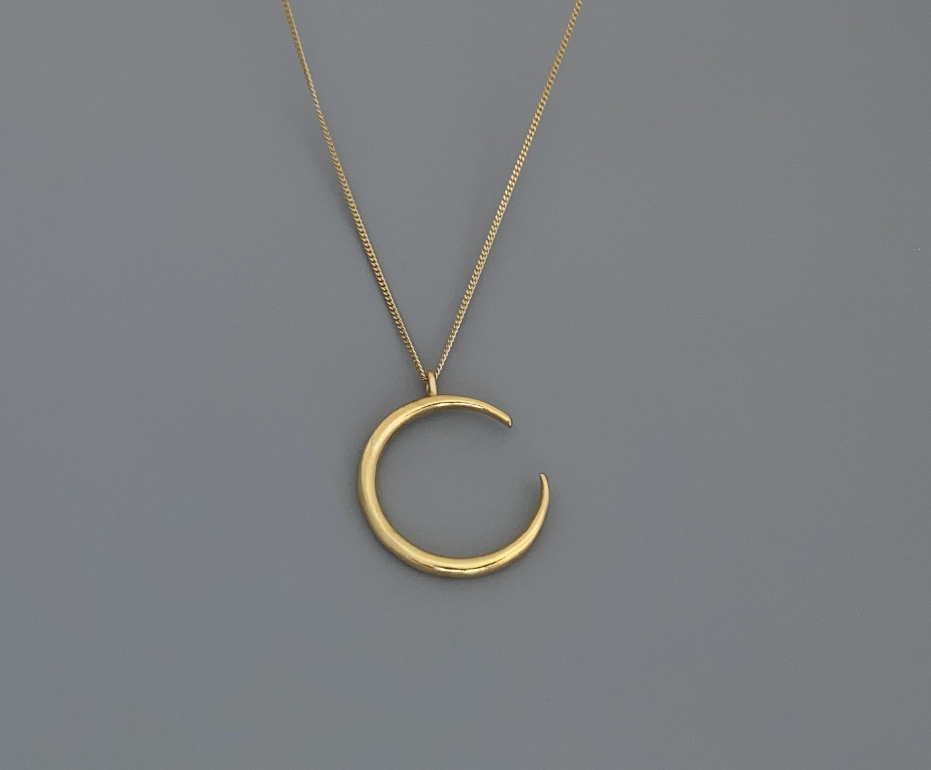 The crescent measures 25 mm across and is suspended from a fine curb chain, 60 cm long.