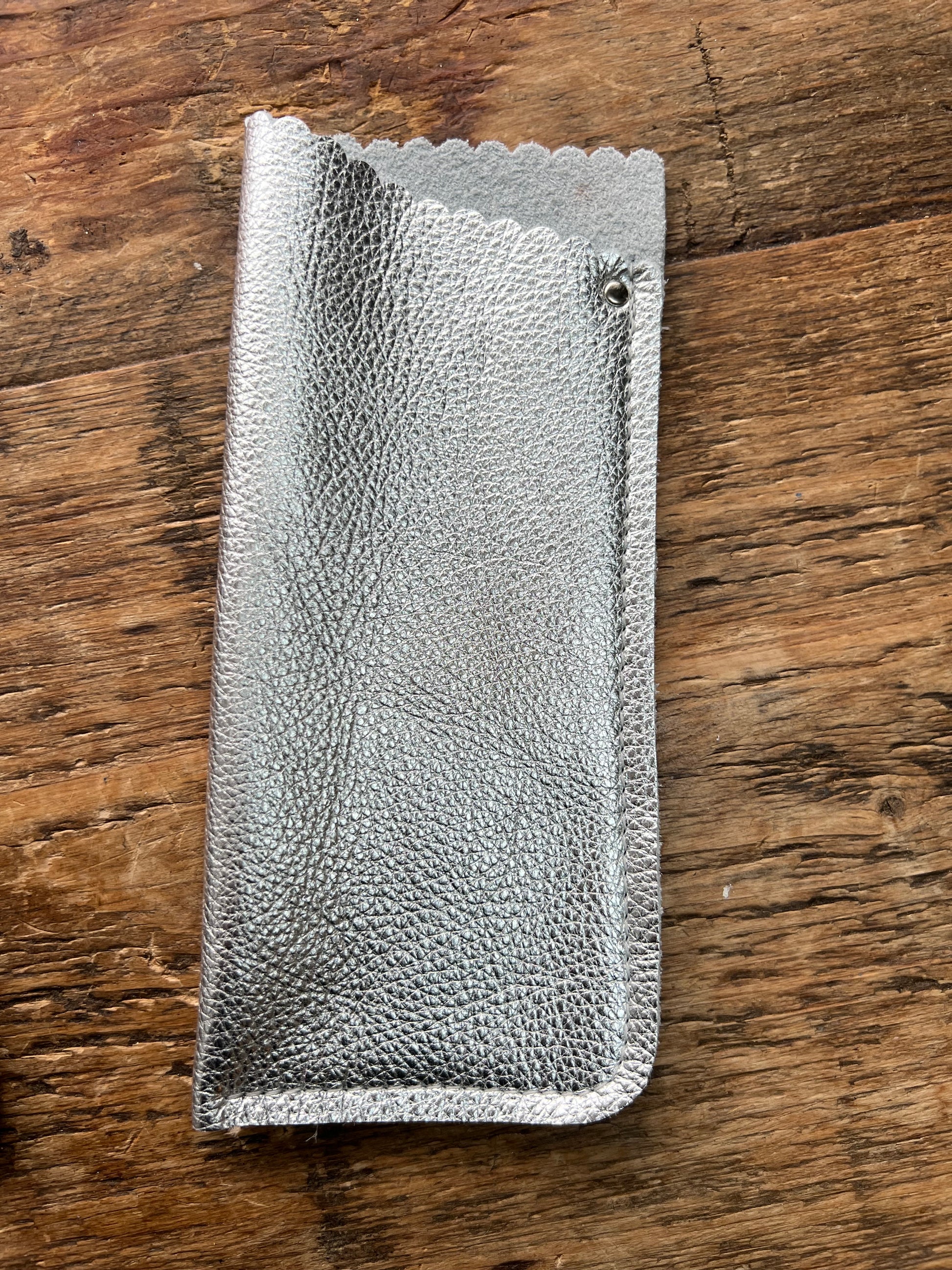 Beautiful and useful! Handmade leather glasses or sunglasses case in 3 colours. Metallic silver, metallic pewter, and soft black. Size 3" x 7" long. Perfect gift. Finished with a scallop edge.