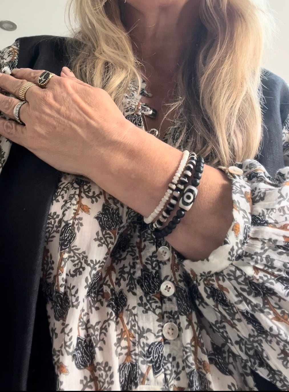 Handmade to order- trio of bracelets , semi-precious - Tibetan faceted agate ,mother of pearl bracelet with agate bead , all finished with a sterling silver bead.
